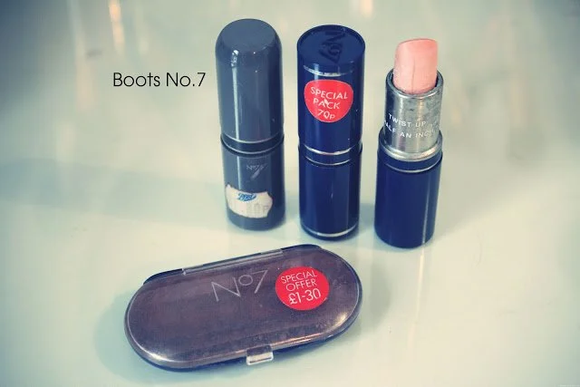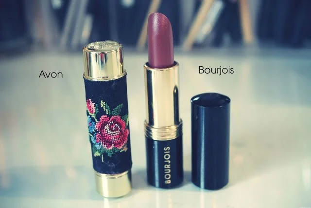 I love the price labels on the Boots No.7 products... just 70p for a lipstick, I wish! If you look closely you'll see the instructions on the lipstick, "twist up half an inch". What I found really interesting is that the Bourjois lipstick looks much more luxury and expensive than the other brands. Bourjois is a big favourite in the beauty world and we all remember those rumours of it being manufactured in the same factory as Chanel (I don't think it's true) - it looks really nice in the sleek black packaging. And then there's the Avon lipstick, which is by far the most luxury looking of them all, packaged in a fabric lipstick holder!