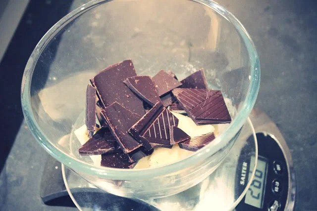 Put the cubed butter and broken up chocolate into a heat proof bowl and place over a saucepan with about an inch of barely simmering water in.