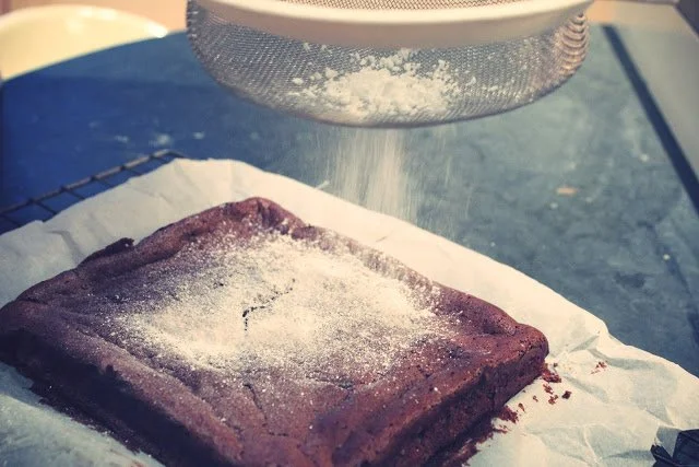 Let the cooked brownie mix cool before dusting with icing sugar (an ordinary sieve will do the trick) to give it that snowy Christmassy feel, then cut into bite size chunks.