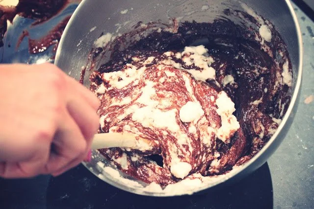 Start by folding in one dollop of egg whites to the chocolate mix, then add the rest in stages all the time folding in so as not to knock out the air.