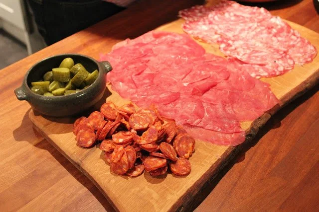 It was a small get together with friends and everyone was asked to bring a cheese, meat and drink of their choice. When guests arrived their food was put on display and a little toothpick sign was made with the name of the cheese.