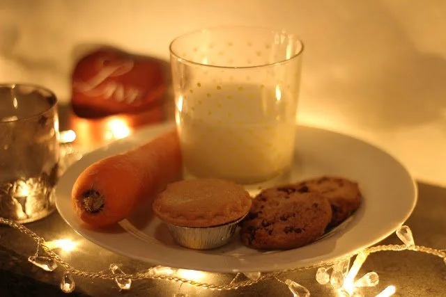 A glass of milk, cookies & a mince pie for Santa and a carrot for Rudolph.