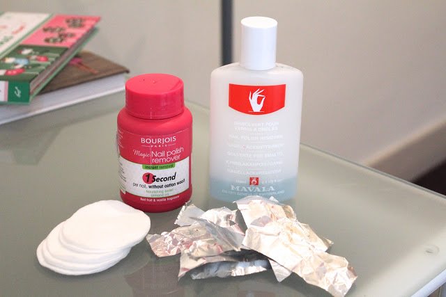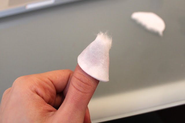 I then take 5 round cotton wool pads and tear them in half so I'm left with 10 pieces. I soak each piece with nail polish remover and I find using one with acetone in it works best. After soaking the cotton wool, I wrap them around my finger and then wrap tin foil over the top. It's best if you cut the foil up into 10 strips first so they're all prepared.