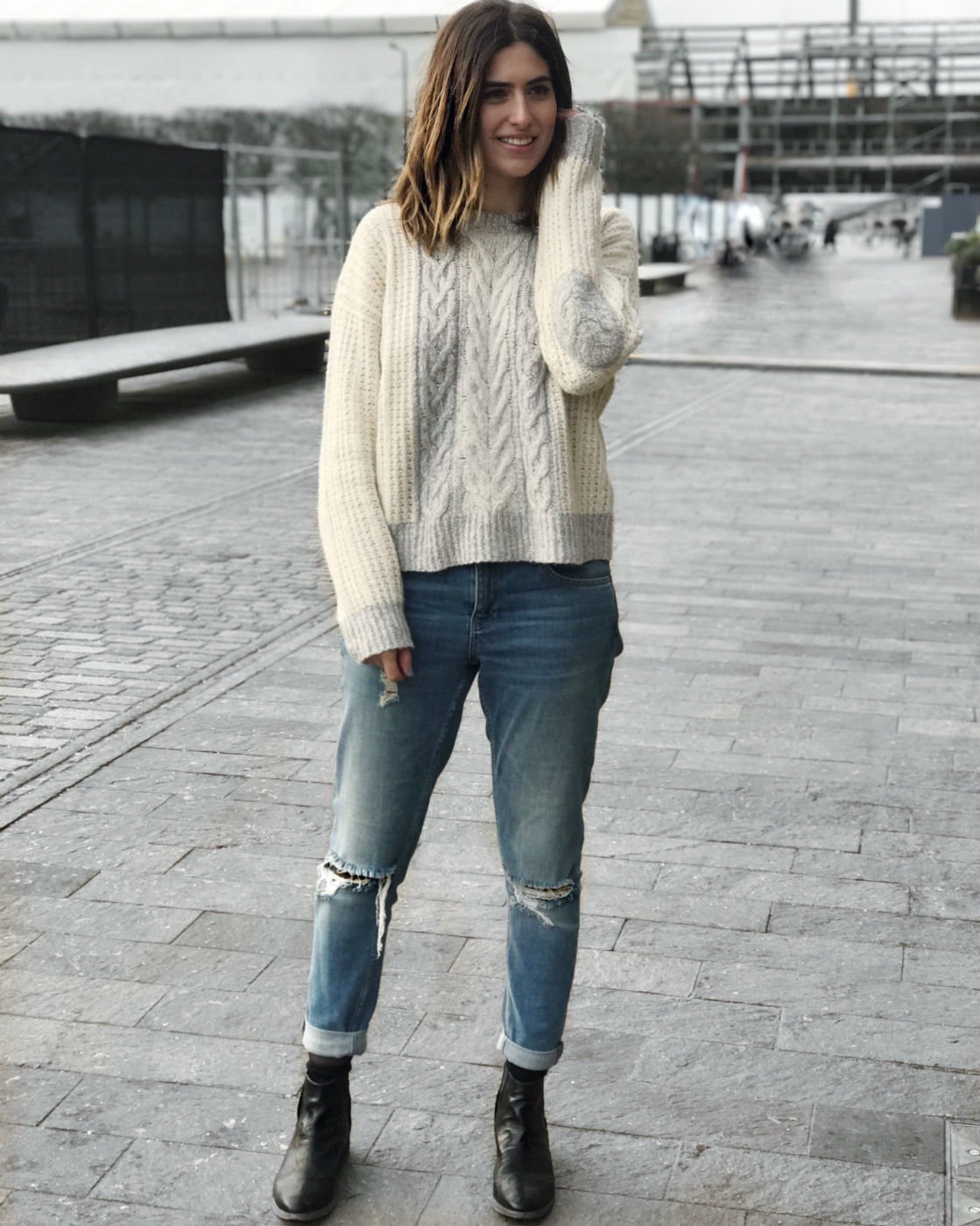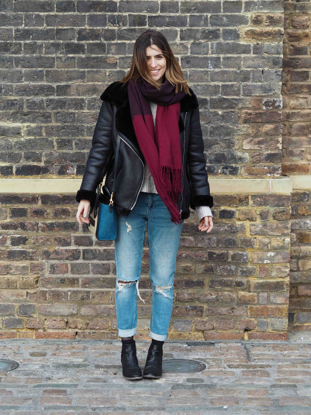 I don't think I've posted photos of my new-ish coat so Anna kindly took some snaps of me after lunch. I found it in Zara just before Christmas, not knowing that it had been sold out for ages, I must have got lucky. After falling in love with an £800 aviator coat in Reiss I was so happy to spot this much more affordable version in Zara. The faux leather isn't the best and neither is the faux fur to be honest, but it keeps me warm and it looks good. For such a trend piece like this I didn't think it was worth investing in the Reiss one, I've worn this coat almost daily since buying it but I know by next winter my taste would have changed. I'm pretty bored of wearing the same old skinny jeans so I dug my Topshop Lucas jeans out from my summer pile and wore them over sheer tights. I've never tried boyfriend jeans with chelsea boots but I kind of liked the look and I threw on this really cosy knit from Anthropologie to go with them.