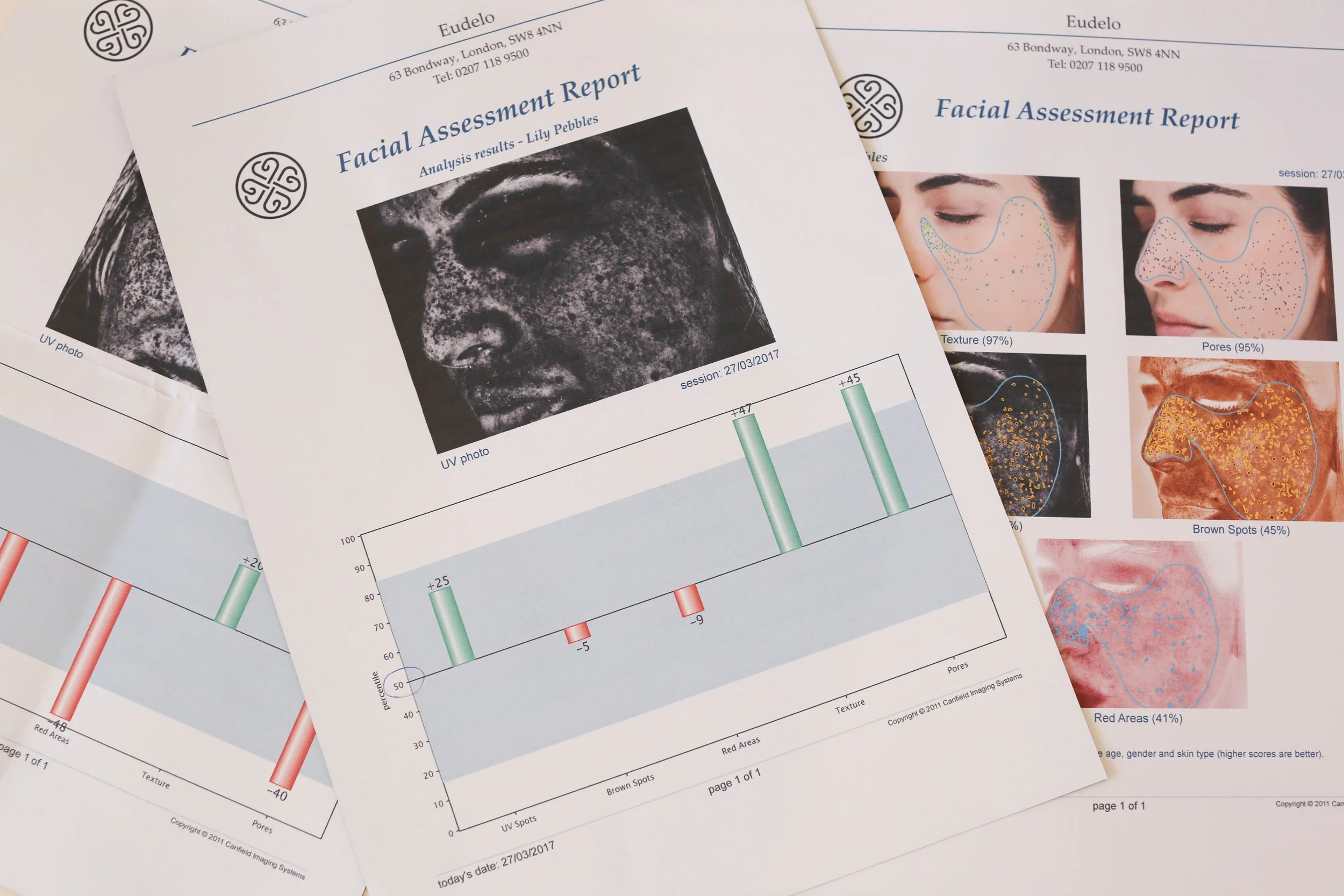 It started with a consultation; a chat about my current skincare routine, things I've noticed about my skin, skin concerns, my exposure to the sun growing up... there were all kinds of questions asked. Dr Stefanie then took a look at my skin under a light to assess for herself but luckily I'm quite good with my skin so she knew what to expect going off what I'd told her. I was then taken into a side room to have my skin analysed by a special skin machine (that's the official name for it I'm sure!). It took 3 close up photos of my face from different angles before printing out a detailed analysis showing results that the human eye can't see. It measured UV spots, brown spots, red areas, texture and pores. We then went back into the consultation room to discuss the results.