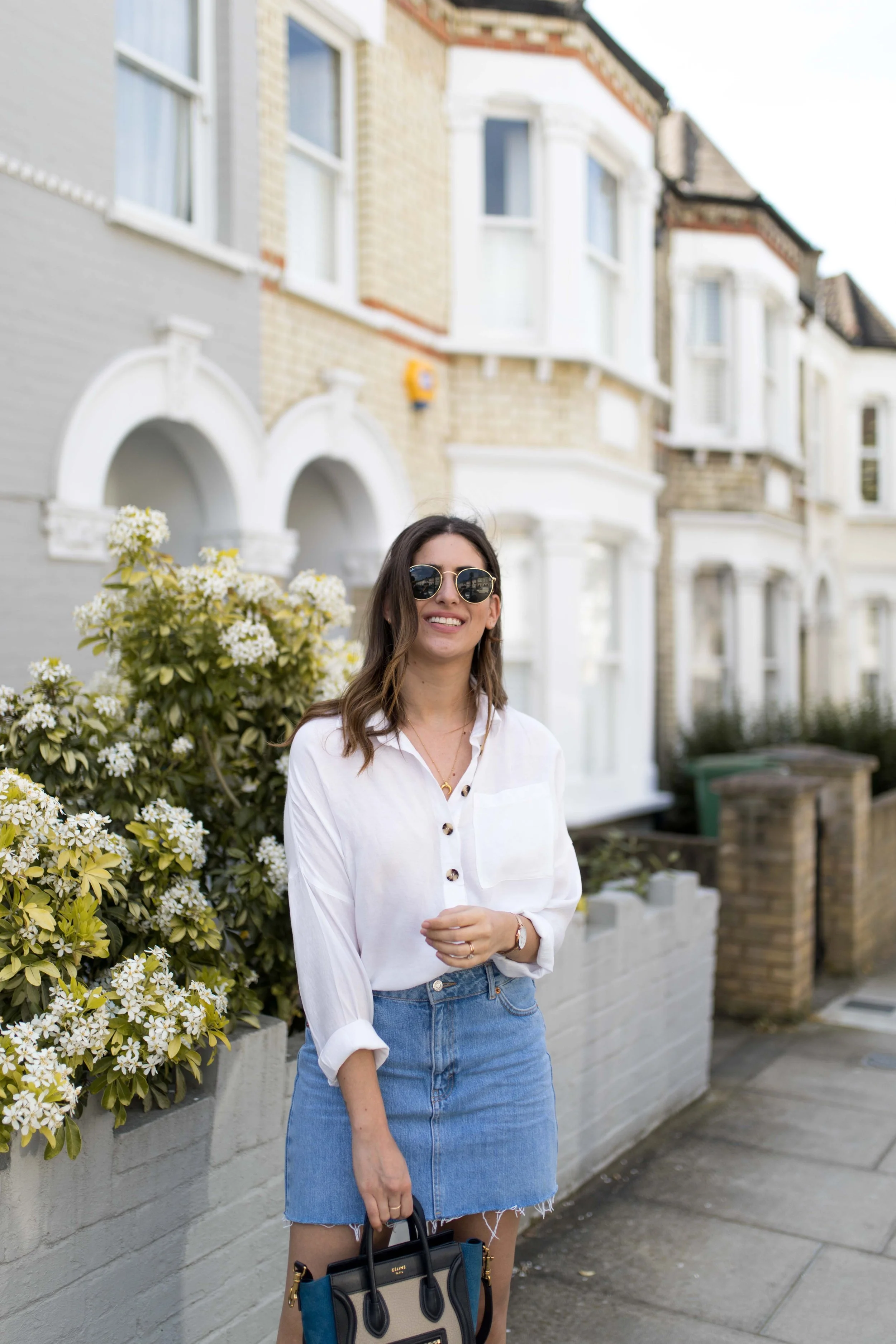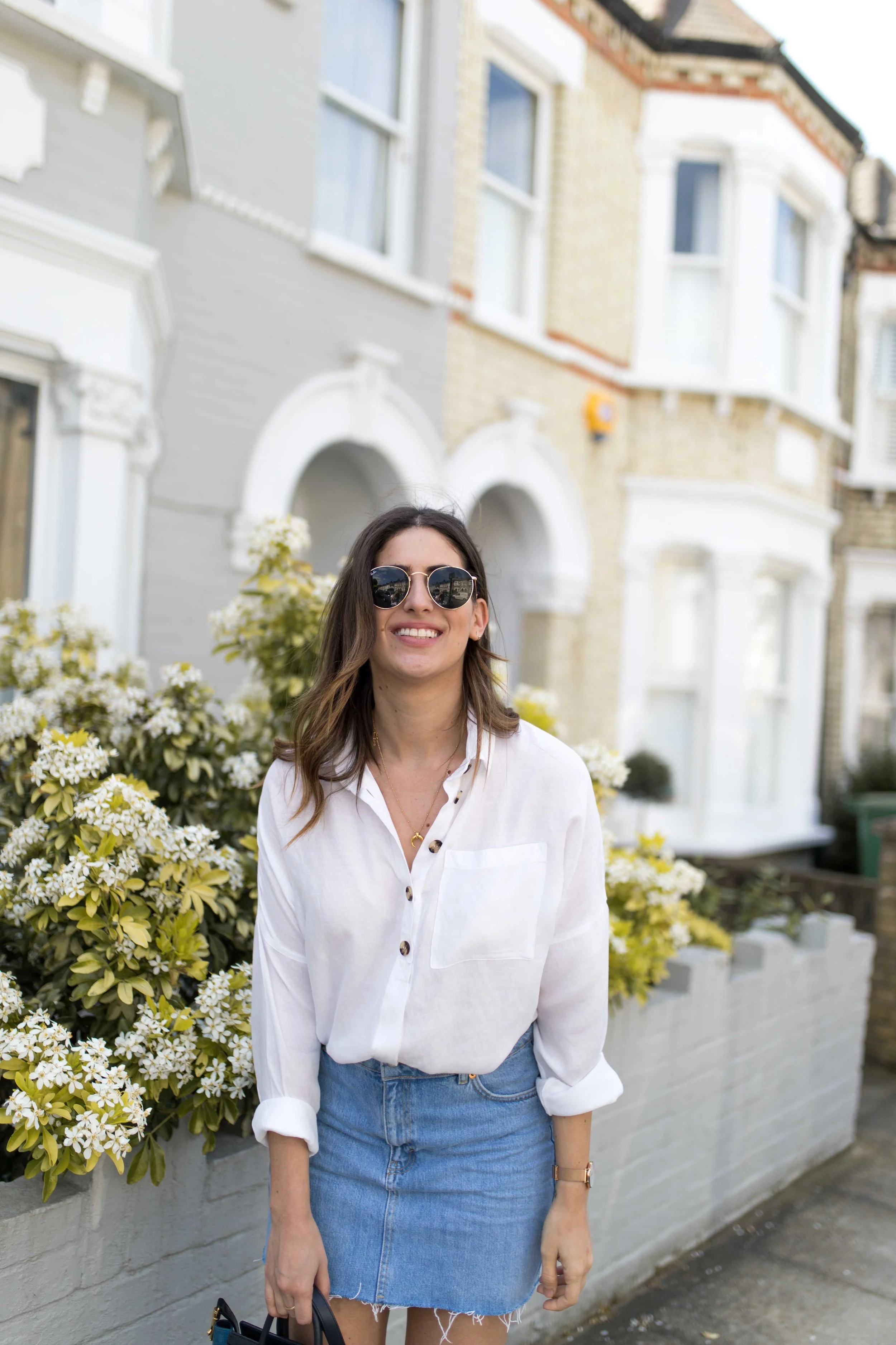 I love a denim skirt as it falls slightly lower than shorts and the shape is actually quite smart so it feels work-appropriate. With a light-weight, white cotton shirt tucked in it's smart but you won't overheat. I paired these with some very casual white converse for a fun look but a smarter shoe would also look great.